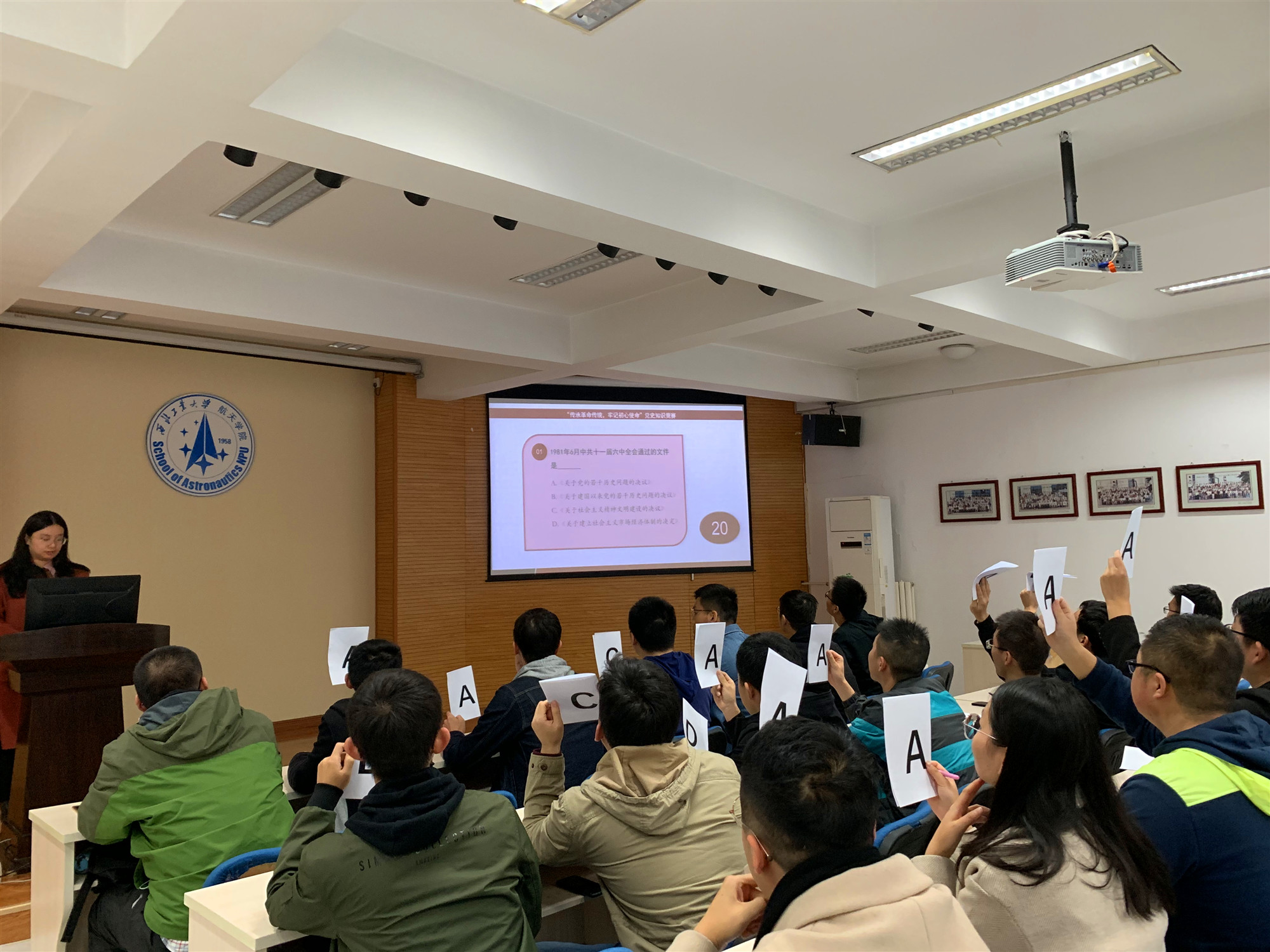 学生支部书记王雅彬介绍了本次竞赛的规则并宣布比赛开始。竞赛的形式严谨且不失趣味,主持人在读完题目后,宣布开始答题后,各位参赛选手在30秒内举牌表明答案,采用一题一答的统计方式,即时反馈正确答案,能够让参赛选手们对党史知识记忆更加明确。竞赛分为必答题和抢答题两个环节。经过必答题环节决出前六名进入抢答题环节,在经过抢答题环节的激烈竞争,最终决出一等奖1人,二等奖2人,三等奖3人。