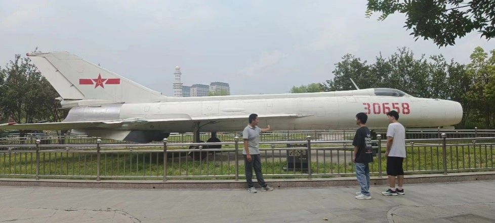 在歼-8战斗机前,实践队员们久久驻足,刘若愚同学为队员们讲述了歼-8战斗机的设计师——顾诵芬院士的事迹。