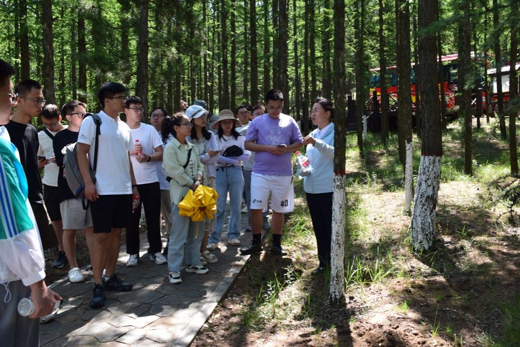 随后,实践队跟随讲解员抵达松涛园进行参观学习。队员们采用实践与学习相结合的方式,徒步穿梭于这片松林天然氧吧,同时一路认真倾听了右玉几十年来治沙造林的历史,亲身体悟当年将沙地变成的如今肥沃黑土的艰苦岁月。在临别时,实践队员们与陪行同志们一起,合唱了《没有共产党就没有新中国》、《团结就是力量》等歌曲,既是表达对先辈们的敬意与感谢,也是对自我奋斗、不断进取的表态。