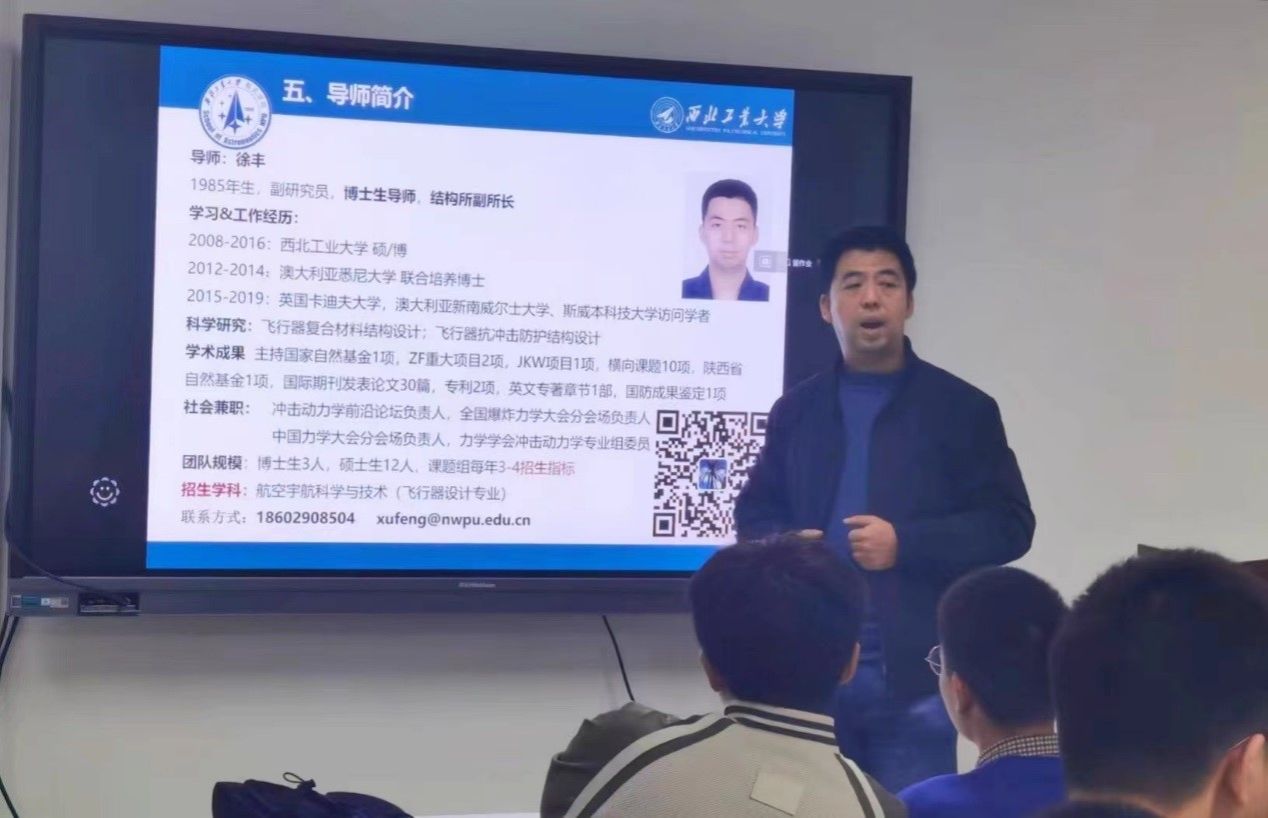 首先,徐丰老师向我们介绍了航天结构设计研究所的基本结构和发展情况,激励同学们不断深化学习,提高自己的学术能力和实践能力,对同学们寄予极大的期望。