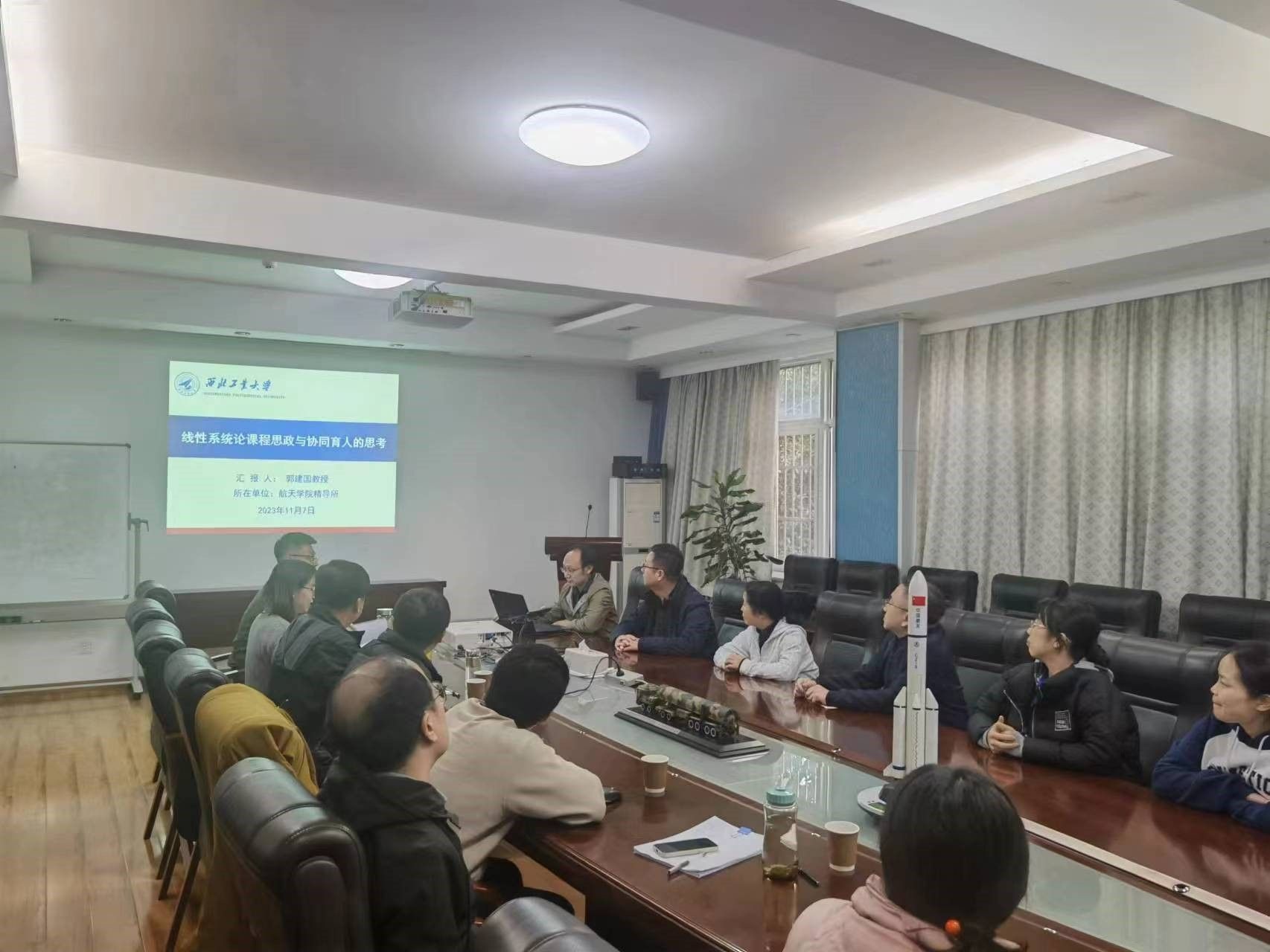 课程思政示范课程和课程思政团队。郭建国教授以家国情怀、责任担当、思辨能力培养和航天工程事例等四个维度,详细介绍了线性系统理论课程开展教学思政的相关事例和融入课程的教学方法。同时也从课程育人、实验育人和实践育人等方面介绍了教学团队在协同育人方面的特色做法和取得的成绩。随后,参会党员和教师针对课程思政和立德树人等方面进行充分的交流和讨论。