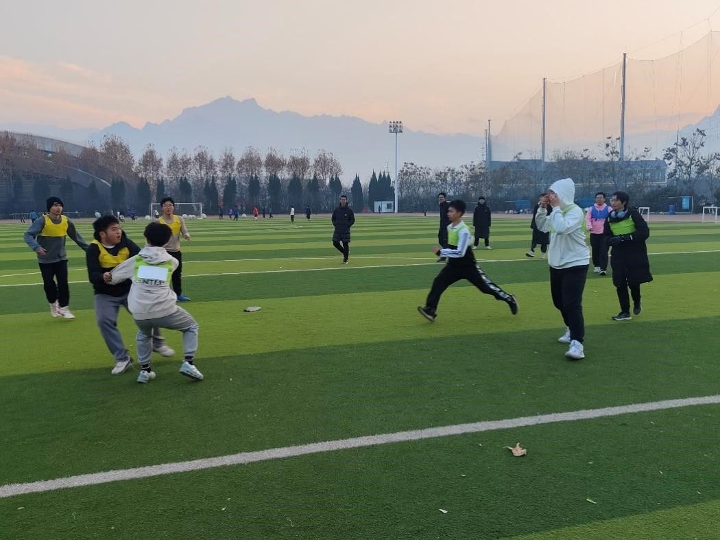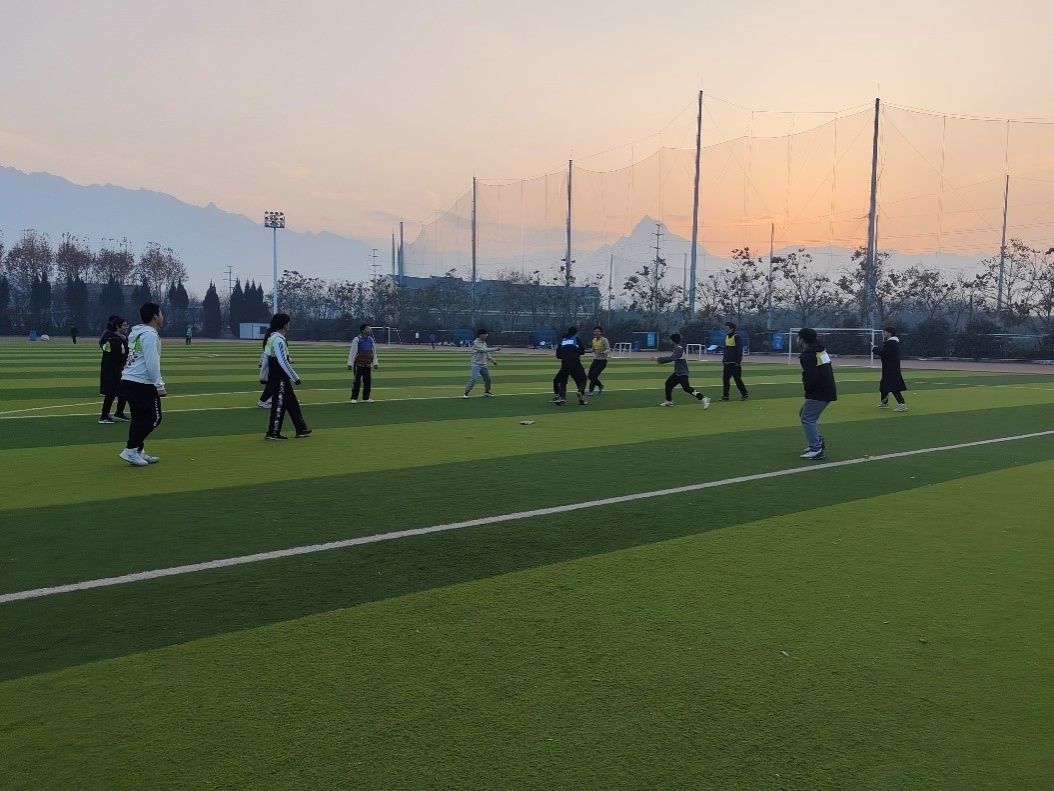 彩霞方好,活力无穷。在一片欢声笑语之中,三支队伍、十五名队员在绿茵场上尽情奔跑、相互追逐。“战场”形势“风云诡谲”,队员们制定“计策”,紧密配合,共同为我们呈现了一场体力与“谋略”相结合的精彩“战斗”。