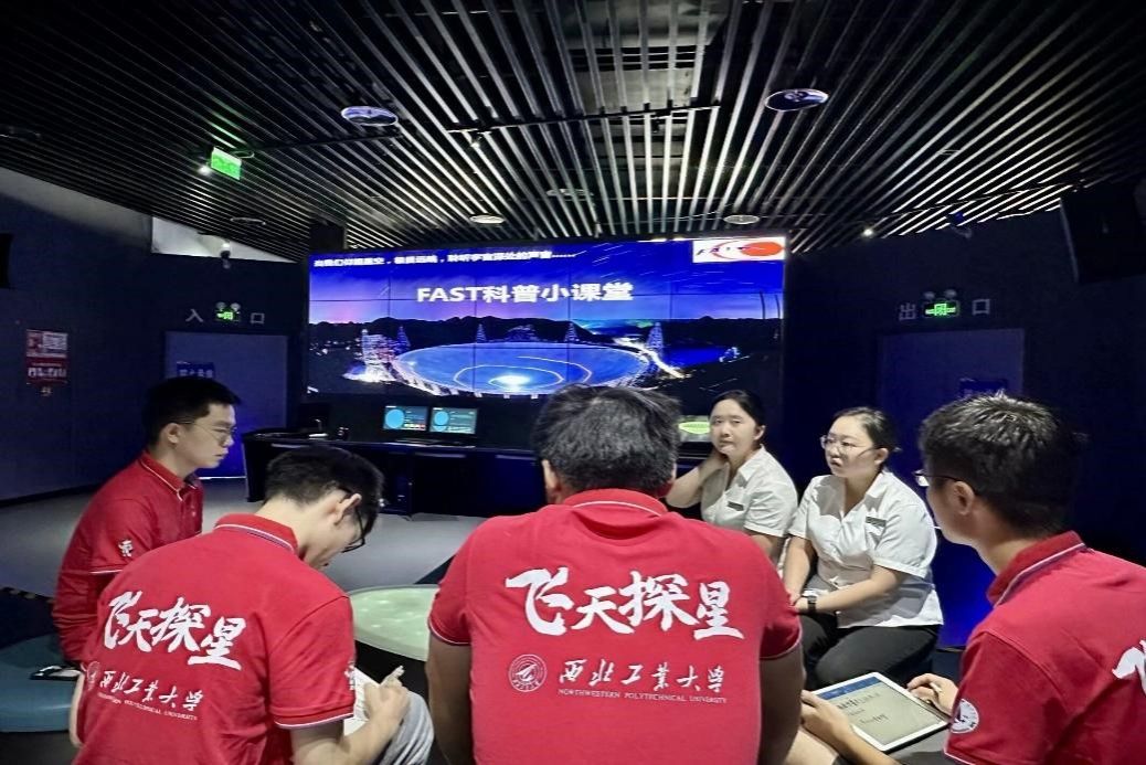 随后,实践队成员与相关研究人员展开交流。实践队成员依托航天领域背景,基于所学专业知识,就选址、建造、成像、探测、信号接收等方面深入学习和探讨。研究人员介绍:人民科学家、中国国家天文台首席科学家南仁东带领团队从零开始,面对资金短缺、技术难关、环境恶劣等诸多挑战,始终以坚定的信念和顽强的意志推动项目进展,历经20余年,最终将这一宏伟的工程从构想变成了现实,将中国的单口径射电望远镜推至世界领先水平。大家充分认识到中国天眼的科学意义与技术突破,体会到国之重器对国家发展的重要推动作用,并领悟到科技赋予时代的力量和创新精神的深刻内涵。