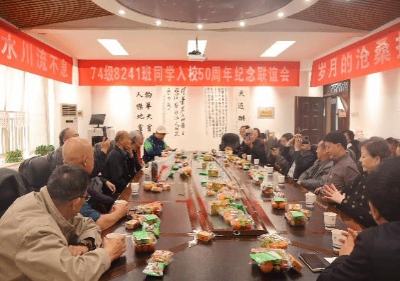 10月13日74级8241班16名同学从沈阳、北京、上海、武汉、贵阳、襄阳和河南新县等地集中返校并召开了师生座谈会。会议室正面高挂着横幅: “74级8241班入校50周年纪念联谊会”,两侧一幅是“同学之间的情谊如溪水川流不息”,一幅是“岁月的沧桑抹不去校园的回忆”;表达了同学们的真实感受和热切期盼。会议室后面悬挂“感谢母校,感恩老师,感念同学,感悟人生”的横幅,充分表达了同学积极参加这次联谊会的真正目的。JavBus