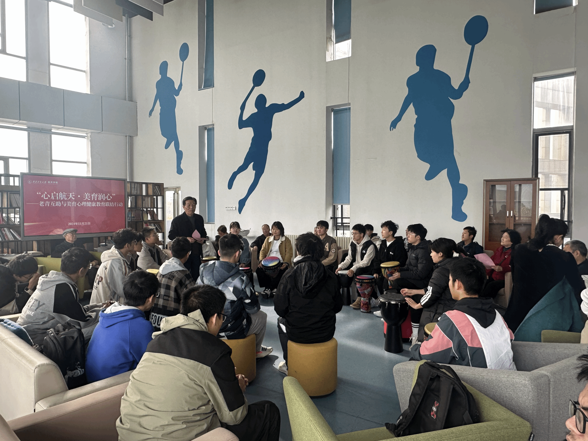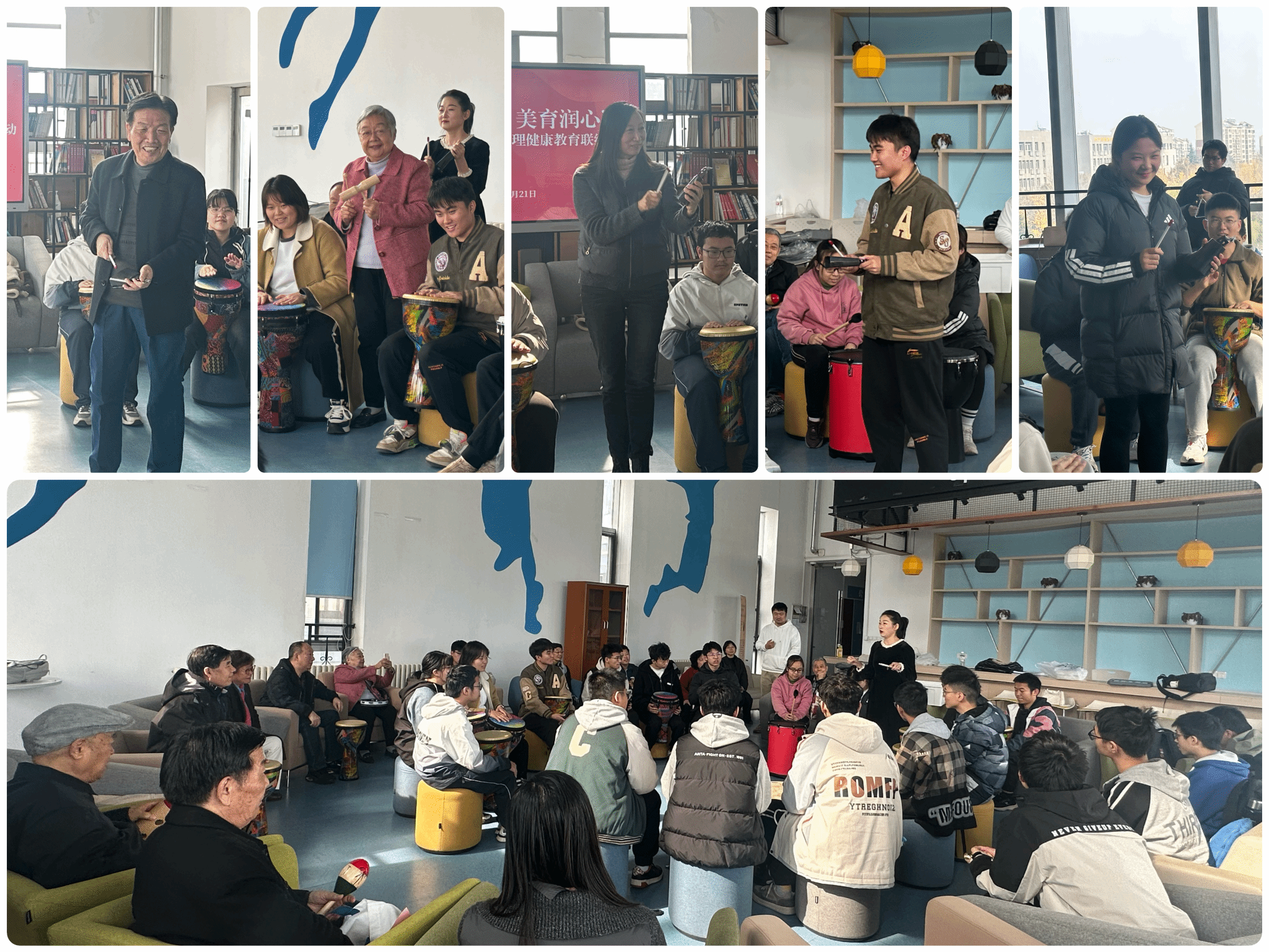 活动伊始,全体参与者共同体验了一场别开生面的鼓圈团体音乐活动。大家通过鼓点、节奏和旋律的协作,感受到了音乐的魅力,同时也拉近了彼此之间的距离。这种体验式的沙龙形式,让老一辈与青年学子在轻松愉快的氛围中迅速融入,为后续的交流互动奠定了良好的基础。