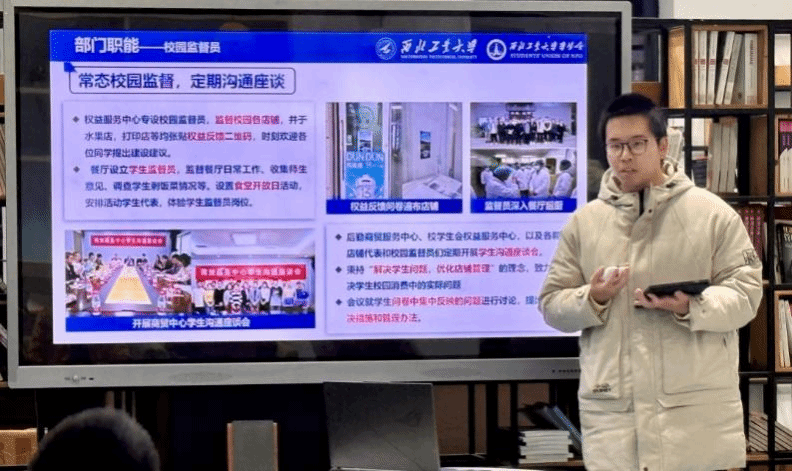 学生会权益服务中心的部门职能,普及了问题反馈渠道,展示了提案收集的方式以及至今所落实的成果。