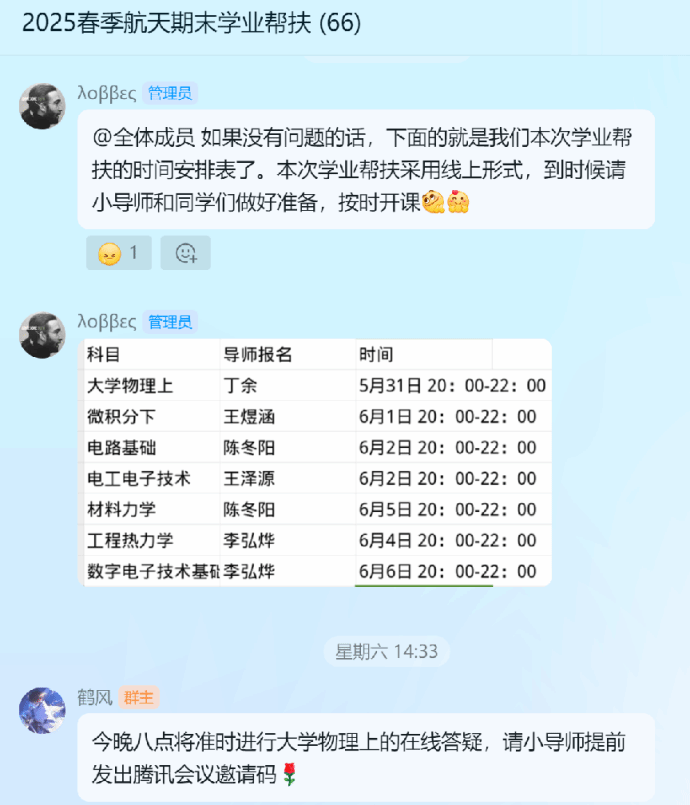 本次“云端助学,逐梦航天”期末学业帮扶活动以线上答疑为核心形式,精准聚焦大一、大二七门核心科目复习难点,通过“学霸”小导师实时解惑、配套资源共享等多元举措,助力同学们攻克知识难点、梳理复习脉络,切实提升备考效率。