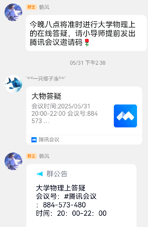 活动自 5 月 31 日至 6 月 6 日连续开展,每次聚焦一门核心科目,以“腾讯会议”为载体打造沉浸式答疑场景。每场 2 小时的直播中,小导师们采用“知识框架串讲 + 典型例题拆解 + 实时互动答疑” 模式,精准击破复习痛点。每场会议设置 “自由提问” 环节,同学们实时连麦或文字互动,导师团队均给予细致解答。