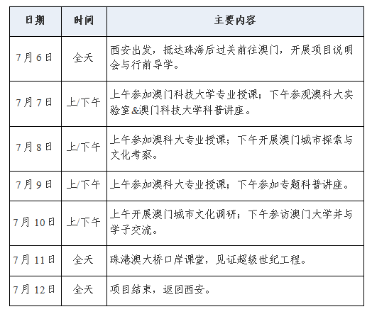 2、参访澳门科技大学、澳门大学,澳门理工大学和澳门科技馆等机构,充分了解澳门的学习和工作,游览澳门历史文化遗产,体验澳门文化;