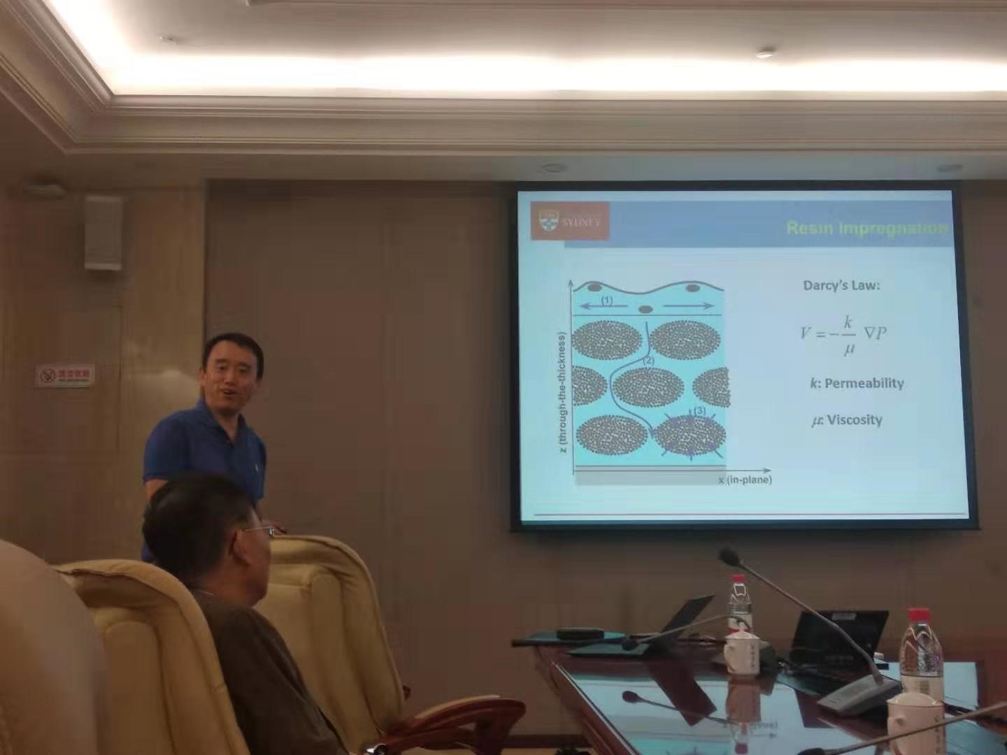 的师生前往悉尼大学进行交流和深造。接下来,Ye Lin教授报告了纤维增强复合材料在当前发展中遇到的机遇和挑战,以及他对这些问题的思考和展望。纤维增强树脂基复合材料具有优异的比强度和比刚度,在航空航天、绿色能源和远洋运输等行业中具有广泛应用。过去半个世纪以来,通过对增强纤维、树脂基体以及两者间界面性能的不断优化,复合材料的性能得到了长足的进步。近年来,纳米增强材料(如石墨颗粒、碳纳米管)的引入进一步提高了复合材料的性能,并赋予材料新的功能性(如自感知、自修复等)。报告深入浅出地介绍了在解决先进复合材料的“加工-结构-性能关系”这一核心主题的发展历程,并分析了先进复合材料结构在向自感知和自修复等新功能发展中面临的关键问题和挑战。Ye Lin教授幽默风趣、博学多闻、温文儒雅的报告赢得在场师生的阵阵掌声。最后,在提问互动环节,Ye Lin教授针对与会人员提出的复合材料制造工艺、性能预示和破坏判据等热点问题进行了专业解答。