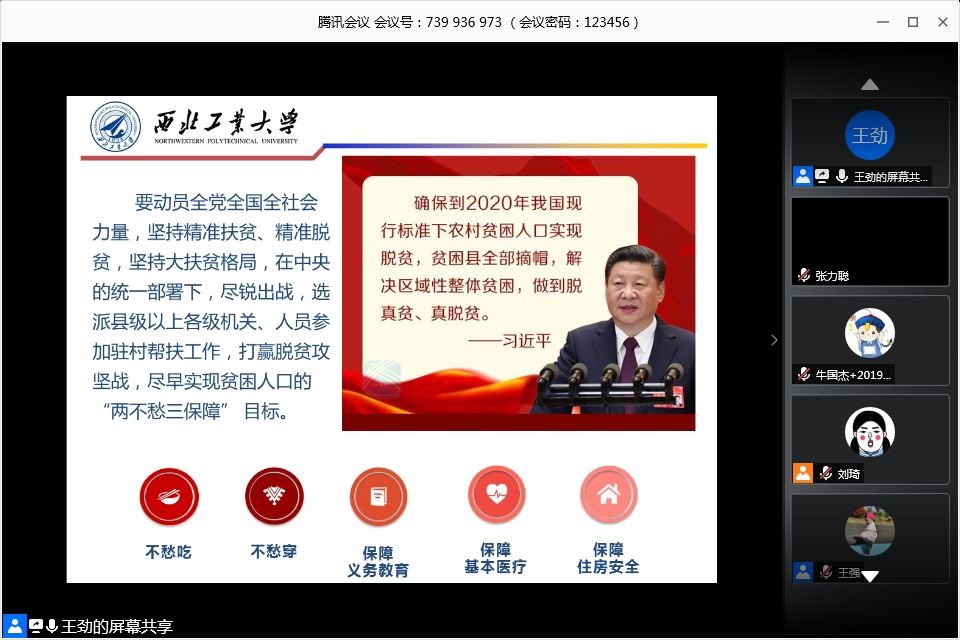 王劲从驻村工作情况、疫情防控措施和青年学子与脱贫三个方面进行了分享与交流。在驻村工作中,王劲因地制宜、因人制宜,不断适应学习,完成了从JavBus 到乡村工作角色的转变。立足于本村实际,制定了“红色教育+国防教育+消费扶贫”的脱贫攻坚发展路线。不仅如此,王劲还有效利用西工大优质科教资源组织开展暑期支教、社会实践等多样化教育帮扶形式,阻断贫困代际传递。在新冠肺炎疫情防控工作中,充分发挥农村基层组织和党员的先锋模范作用,设立检查站严防疫情输入;利用微信、抖音等网络媒介进行防控宣传;落户到人,做好登记等。最后,王劲就“青年学子与扶贫”的话题发表了自己的看法:青年一代是具有创造力和想象力的一代,是打赢脱贫攻坚战的主力军,需要不断地在生产活动和社会实践中励练自己,正所谓“拔节抽穗,培根铸魂正当时”。