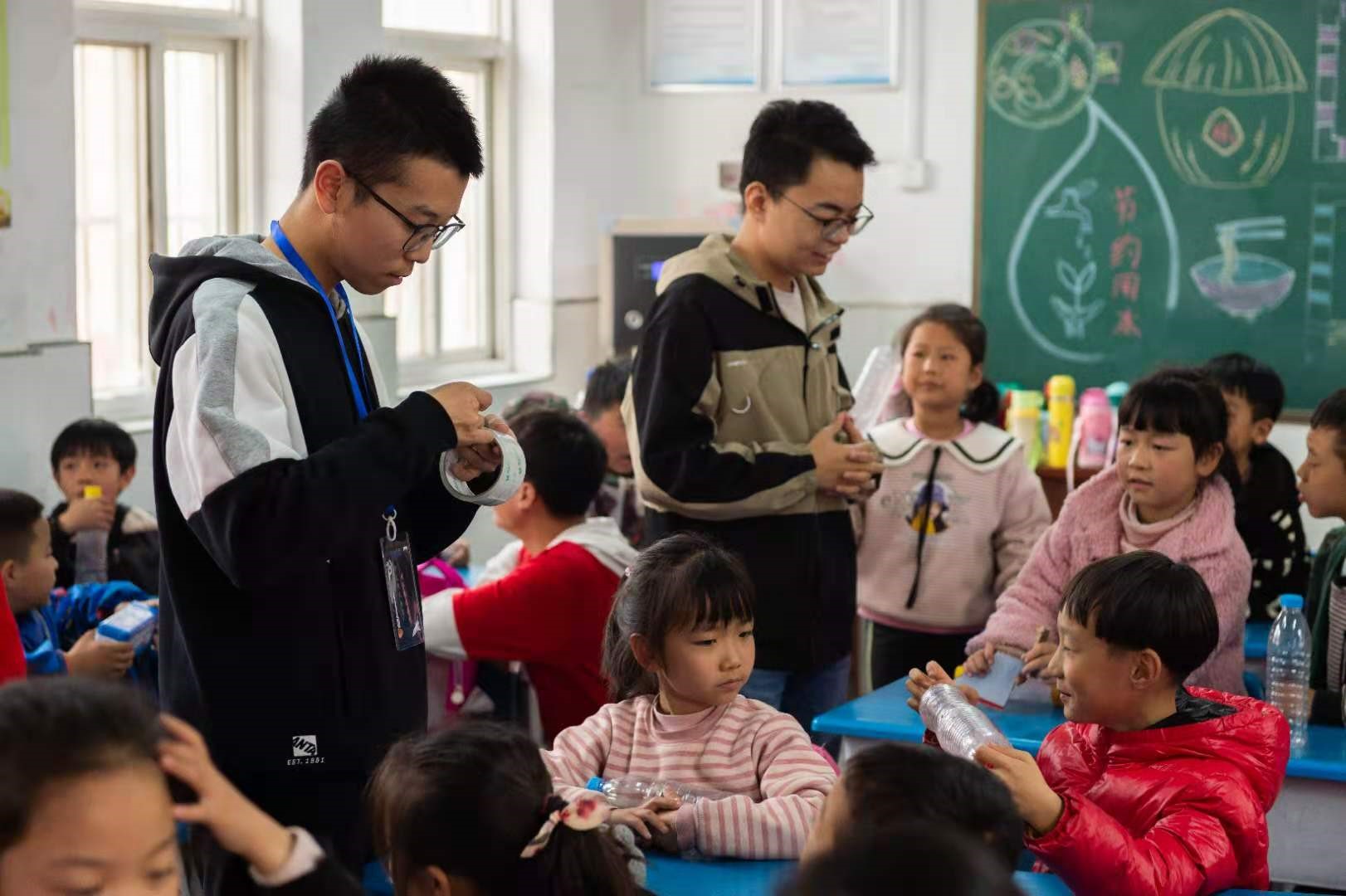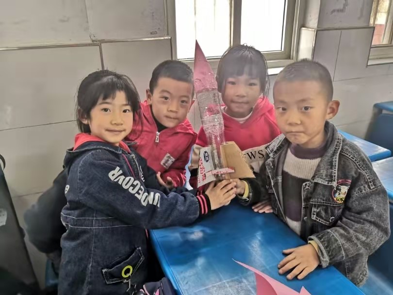 航天知识讲解环节结束后,志愿者开始教孩子们制作水火箭。同学们拿出事先准备好的饮料瓶、剪刀、胶带、卡纸等材料,在大哥哥大姐姐们的帮助下,完成了简易水火箭制作,并满怀欣喜地将自己的名字签在箭体上。