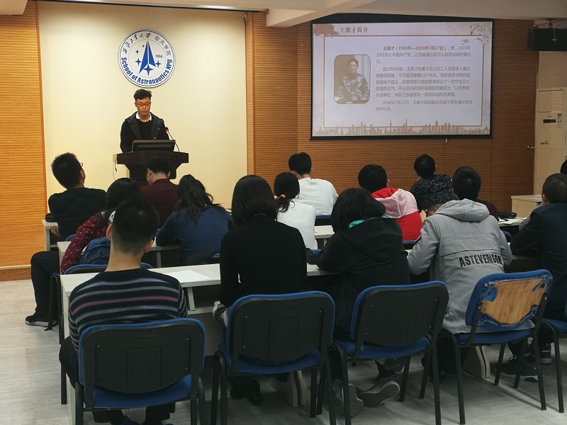 会上,罗淑娟传达了习近平总书记要求各基层党组织开展向黄群、宋月才、姜开斌同志为代表的抗灾抢险英雄群体和王继才同志学习的精神,学生党员骨干王昭、陈海飞、黄鹏飞同志分别带领大家学习时代楷模王继才、黄群、宋月才、姜开斌等同志先进事迹。王继才同志以海岛为家,把青春年华全部献给了祖国的海防事业;黄群同志面对台风和巨浪时,不惜以生命争取时间保护国家重点试验平台;宋月才同志不为国外高薪聘请所动,以舍小家顾大家保国家的情怀,为祖国建设贡献了毕生力量;姜开斌同志在退休之后仍以一名“老兵”的热忱和执着参与试验平台工作,手把手地带出一支高水平的专业队伍。这些时代英雄们在祖国需要他们的时候,都义无反顾的选择了投身祖国。他们用实际行动诠释了共产党员对党忠诚、恪尽职守、不怕牺牲的优秀品格,用宝贵生命践行了共产党员“随时准备为党和人民牺牲一切”的初心和誓言。