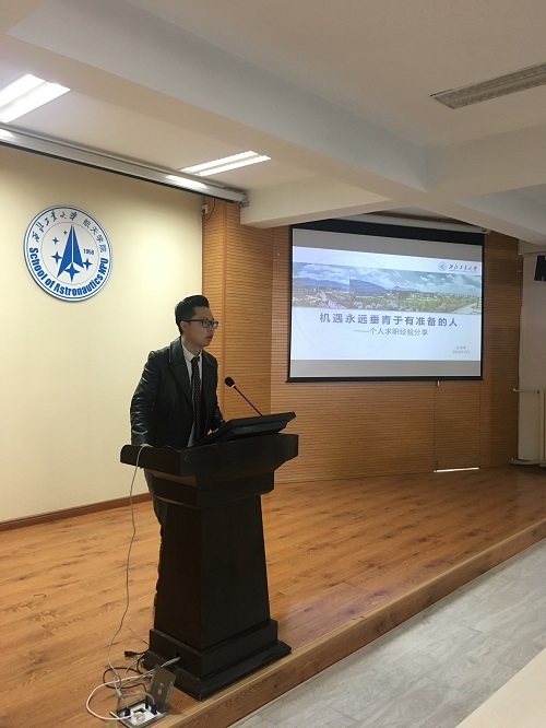 来自探测与制导专业的虞天晔和同学们讲述了自己在各家单位面试中需要经历的面试环节,并介绍了面试过程中可能会遇到的问题。孟祥同学则是告诉同学们要在求职之前多学习掌握专业知识,给自己制定学习计划,这样才能在求职过程中胸有成竹,也更能获得面试官的青睐。