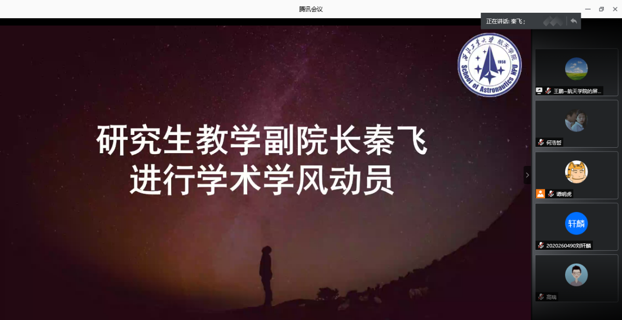 主管研究生教学副院长秦飞从自身经历出发,以研究生的学术学风为主题与同学们进行分享交流。秦飞指出,同学们应围绕航天方面的关键技术进行科研攻关,在新的国际形势下,希望同学们勇挑重担,在我国迈向航天强国的征途上做出贡献。其次,希望同学们学以致用,注重动手,在科研实践中升华所学知识。同时,秦飞指出,同学们应提高独立自主学习能力,建议大家利用刚入学的时间进行文献调研,了解科研过程,掌握本专业方向具体技术,为以后的科研打下坚实基础。最后,秦飞副院长用“特别能吃苦、特别能战斗、特别能攻关、特别能奉献”的航天精神与同学们共勉,希望同学们在JavBus